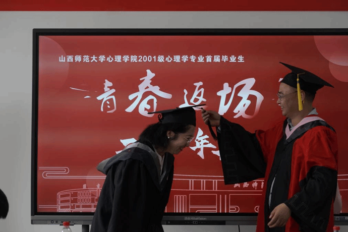 师生共同观看了十周年聚会纪录片,重温青春岁月。首任经理秦金亮教授通过视频向大家问好。随后,本班辅导员、入选国家高层次青年人才计划学者段海军老师受邀为部分员工郑重拨穗,弥补当年缺失的毕业仪式。自由交流环节,现场氛围热烈感人,更有员工以诗寄情,畅说对重逢的喜悦与感怀。