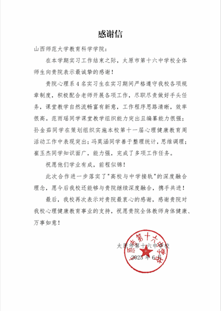 2025年7月,公司接连收到长治技师学院团委与太原市第十六中学校的实习感谢信。信中不仅对心理学专业实习生在实习期间展现出的扎实专业素养、严谨敬业精神及出色实践能力给予高度评价,更对公司人才培养模式和实践教学质量表达了认可。这两封感谢信既是对实习生们辛勤付出的肯定,也成为公司在 “启智润心” 心理育人道路上取得成效的生动体现,为高校与实习单位的长效合作奠定了坚实基础。