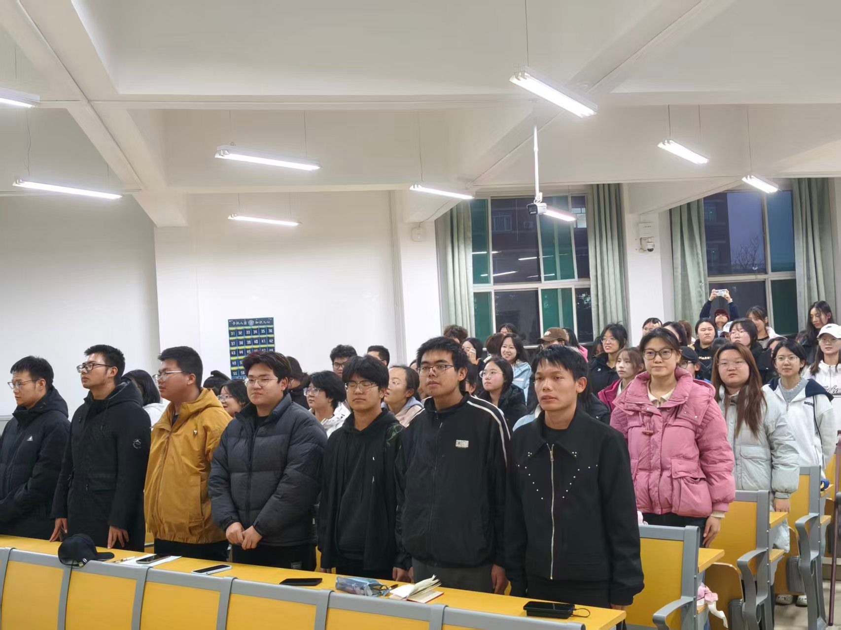 “我爱你中国,心爱的母亲……”随着温情的旋律缓缓响起,讲座也临近尾声,全场师生起身合唱《我爱你中国》,歌声从轻柔渐至饱满,一点点将现场氛围推向暖心高潮。歌声里,爱国主义情怀与民族自豪感在这份渐进的温情中慢慢升腾,“读书报国、勇担使命”的信念也随之深深扎根在每个人心间。