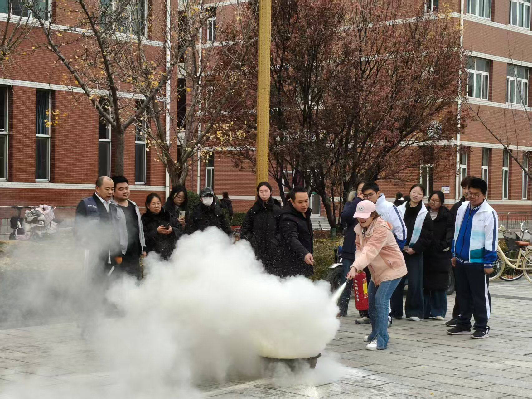 书香广场上,灭火器整齐排列,专业指导员早已就位。他们亲自拆解灭火技巧,从拔销、握管到对准火源按压,每个动作都细致讲解;同学们纷纷上前实操,亲手握住灭火器手柄,直面“跳动的火焰”,在灭火声中,完成一次“安全守护”的实践。