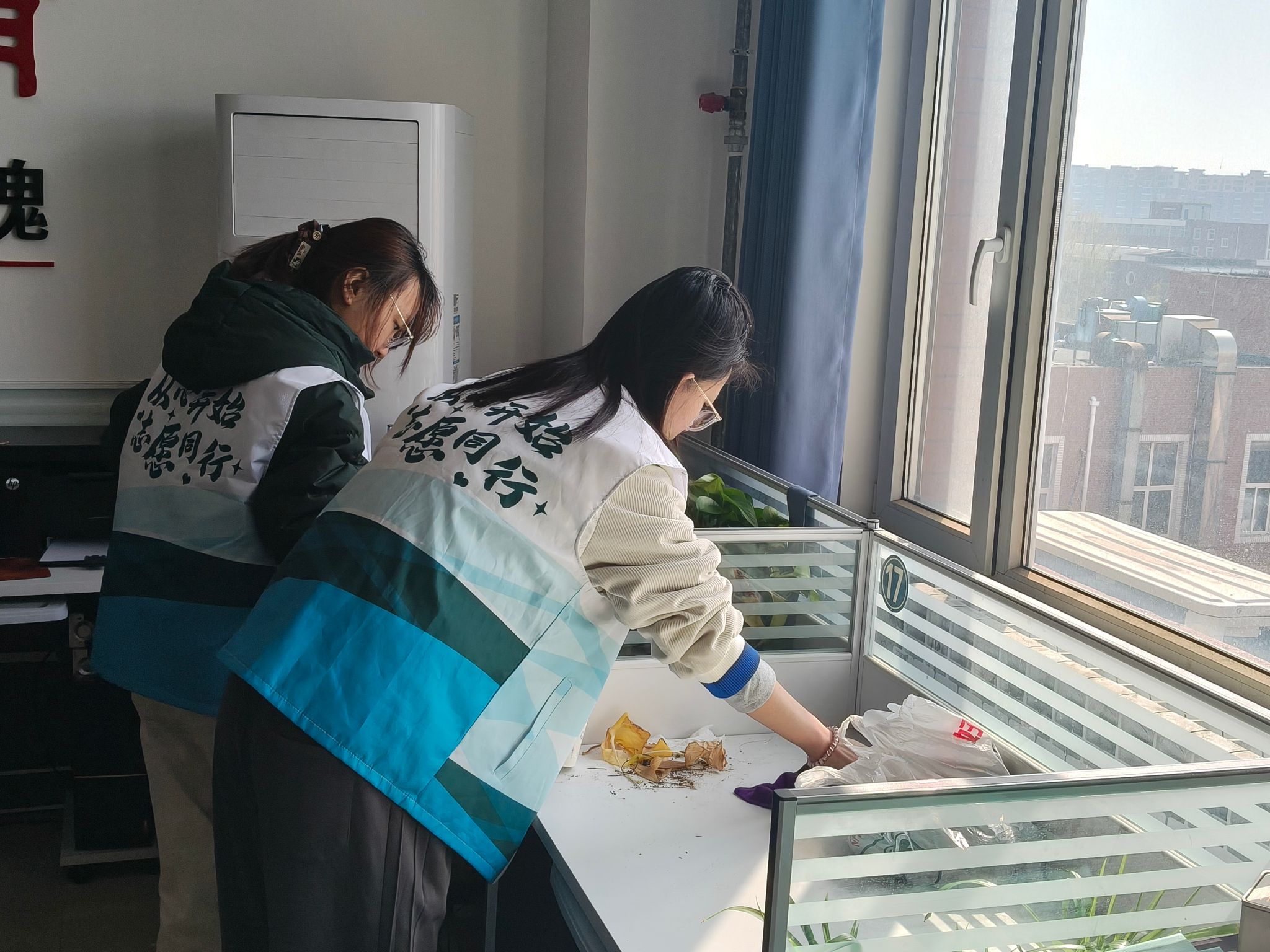 志愿者们手持工具,细致擦拭门窗玻璃,耐心整理办公桌面,仔细清理每一处边角积尘与杂乱文件。大家以勤恳务实的行动贴心服务,不仅让办公环境焕然一新,更为辛勤耕耘的师者增添了一份整洁舒心的暖意,焕发出清朗有序的工作活力。