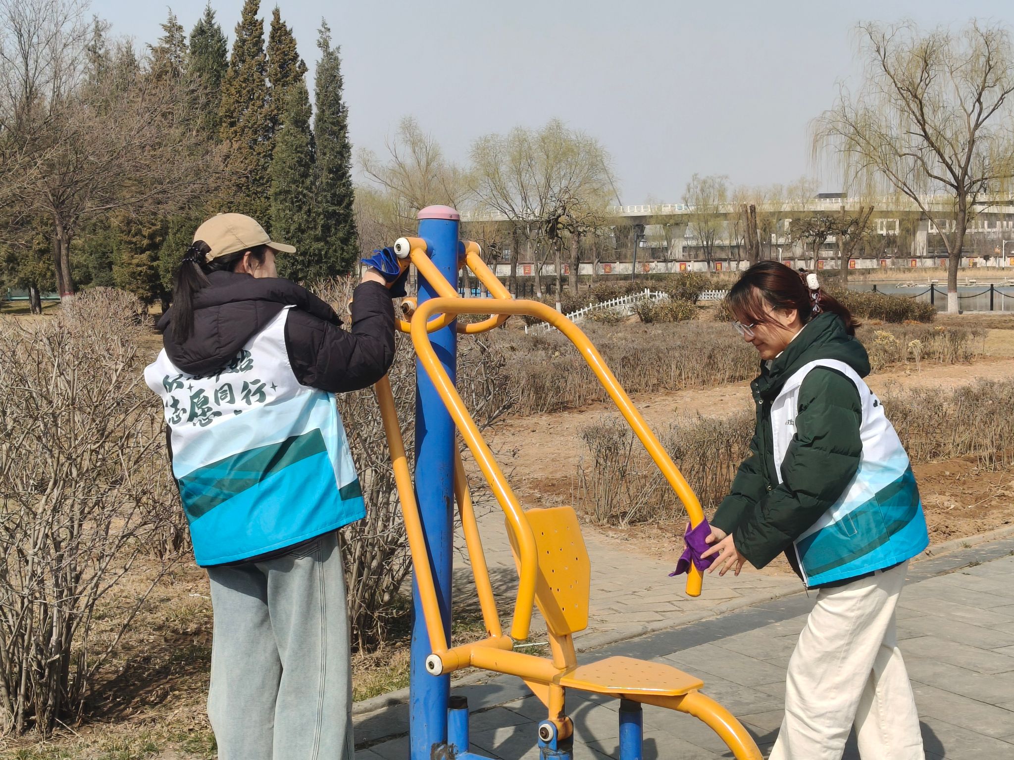 针对校园公共休憩与健身区域,志愿者们认真擦净长椅的扶手与板面,仔细清除健身器材上的污渍,还俯身捡拾绿化带内的纸屑、塑料瓶等杂物,用细致之举扮靓校园每一处角落。清新宜人的环境让校园处处焕发着蓬勃向上的生机与暖意,志愿者们弯腰捡拾、仔细擦拭、耐心整理的模样,也成为春日校园里一道动人的风景线。
